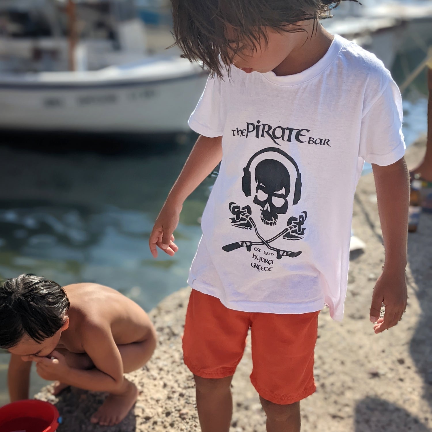 Our Pirate Pride collection is of the design many of you already know and love. Specific to our establishment on the beautiful island of Hydra, this has all the details for you right on the shirt.